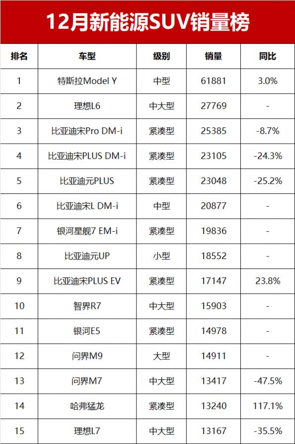 根據乘聯會的最新數據,12月新能源SUV銷量排行榜中,特斯拉Model Y以61881輛的銷量位居第一,同比增長3.0%。緊隨其后的是理想L6,銷量為27769輛。比亞迪宋pro DM-i、宋PLUS DM-i和元PLUS分別位列第三、第四和第五,銷量分別為25385輛、23105輛和23048輛,但同比均有所下滑。比亞迪宋L DM-i銷量也超過2萬輛,以20877輛的銷量排名第六位。