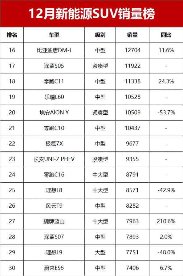12月份零售銷量超過1萬輛的新能源SUV還包括比亞迪唐DM-i、深藍S05、零跑C11、樂道L60、埃安AION Y、零跑C10等六款車型,排名第16至第21位。
