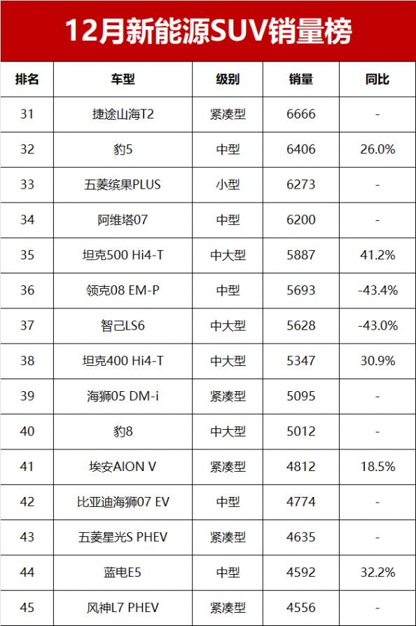 2024年12月零售銷量超過5千輛的新能源SUV還包括坦克500 Hi4-T、領克08 EM-P、智己LS6、坦克400 Hi4-T、海獅05 DM-i、豹8等六款車型,排名第35至第40位。