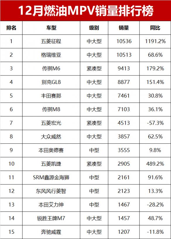 12月燃油MPV銷量揭曉!格瑞維亞亞軍,傳祺M8第六,冠軍出乎意料