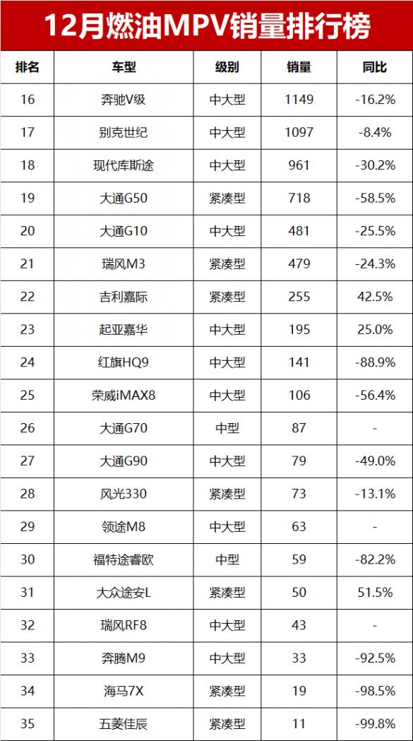 2024年12月零售銷量超過1000輛的燃油MPV還包括本田艾力紳、銳勝王牌M7、奔馳威霆、奔馳V級、別克世紀等五款車型,排名第13至第17位。