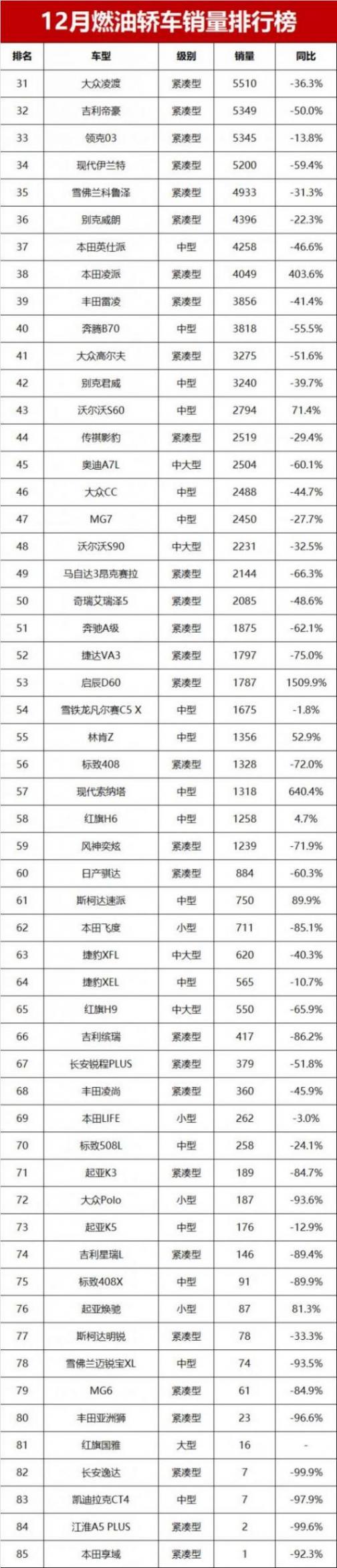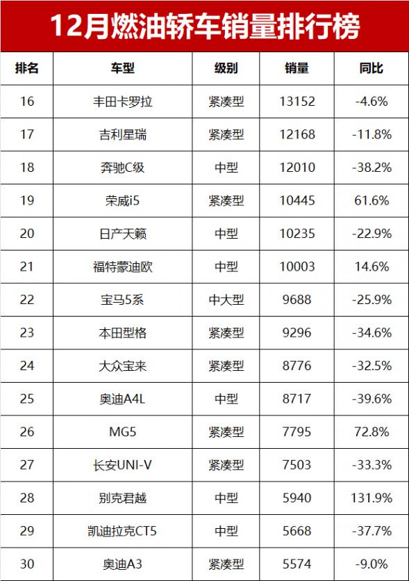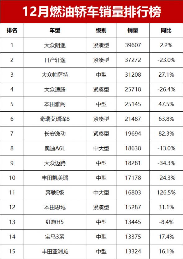 【2024年12月燃油轎車銷量排行榜】日前,小編獲得乘聯會2024年12月燃油轎車銷量數據。數據顯示,12月份燃油轎車零售銷量為55.6萬輛,同比減少15.5%。太慘了!12月燃油轎車銷量榜揭曉,卡羅拉第16,帝豪第32名!