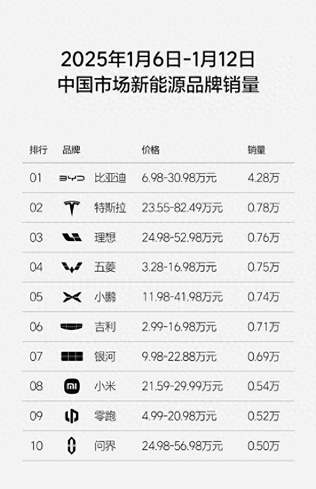 最新出爐的數據報告顯示,2025年1月的第二周內(1月6日至12日),新能源乘用車銷量仿佛被一層無形的霜凍所籠罩,持續保持著低迷的狀態。昔日的銷量霸主比亞迪,盡管依舊以4.28萬輛的周銷量傲視群雄,但這一數字卻僅是高峰時期的一半,猶如一位昔日的英雄,如今也略顯疲態。然而,即便如此,比亞迪仍是這片寒冷市場中唯一一抹亮色,是唯一周銷量突破萬輛大關的品牌。