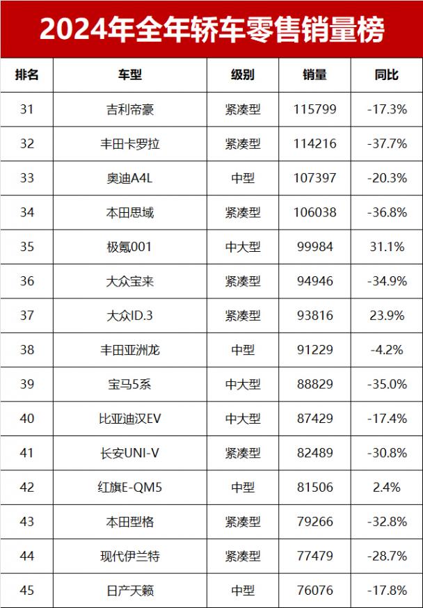 吉利帝豪和豐田卡羅拉2024年銷量都不理想,全年零售銷量分別為115799輛和114216輛,排名第31和第32位。本田思域銷量也只有106038輛,排名第34位。