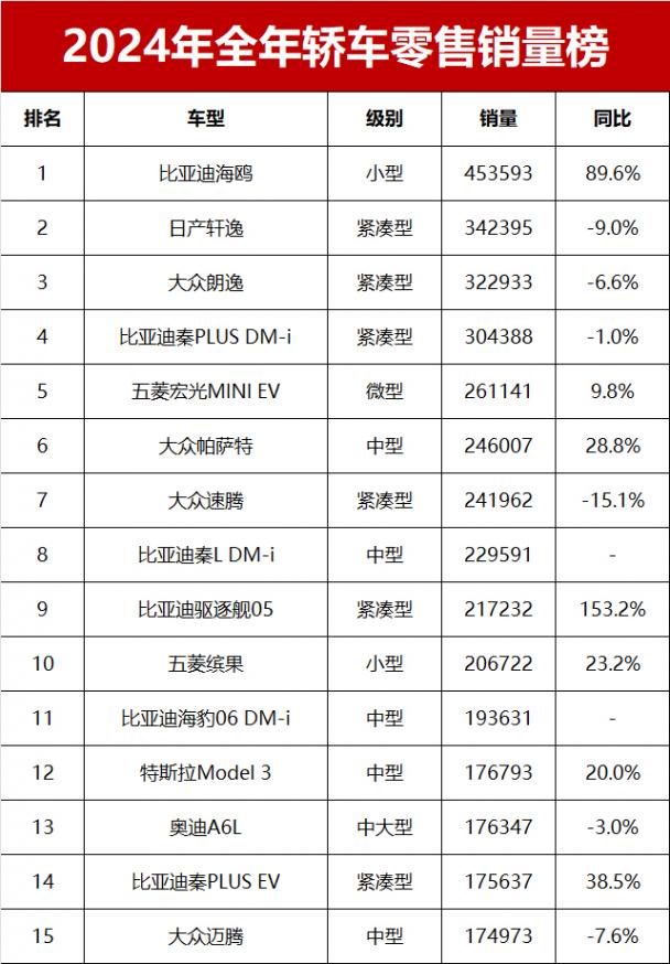 【2024年全年轎車零售銷量排行榜】2024年國內(nèi)轎車市場繼續(xù)保持增長的勢頭,小編從乘聯(lián)會獲悉,2024年全年國內(nèi)轎車市場累計零售銷量達到1049.3萬輛,同比小幅增長1.8%。
