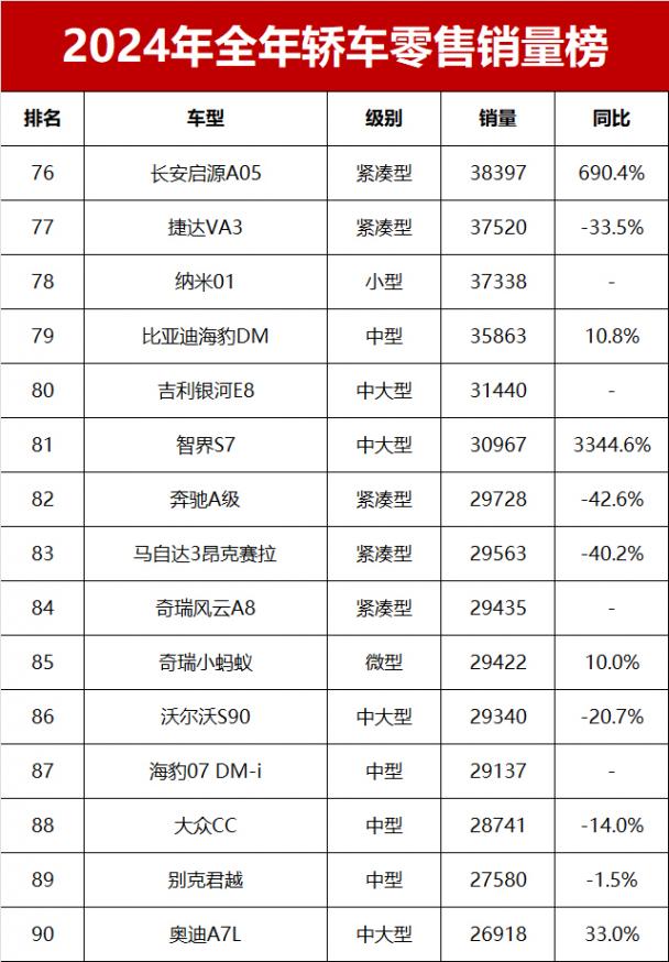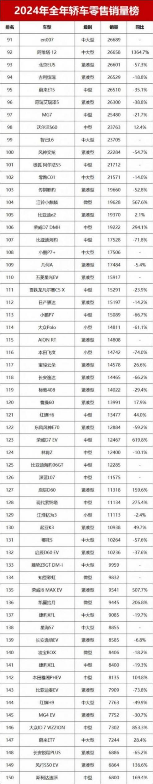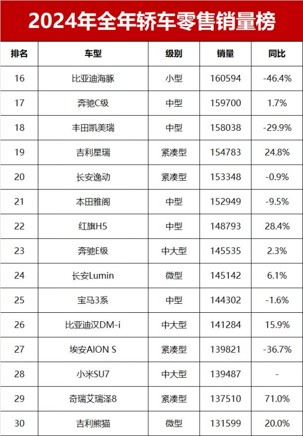 而紅旗H5、奔馳E級、長安Lumin、寶馬3系、比亞迪漢DM-i的銷量則達到14萬+輛,排名第22至第26位。埃安Aion S、小米SU7、奇瑞艾瑞澤8、吉利熊貓緊隨其后,排名第27至第30位,銷量均達到13萬+輛。