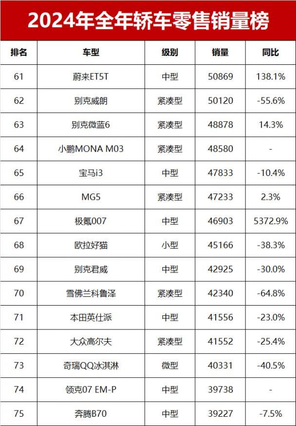來自上汽通用的主力轎車別克威朗和雪佛蘭科魯澤銷量腰斬,2024年全年銷量分別只有50120輛和42340輛,排名第62和第70位,同比分別減少55.6%和64.8%。