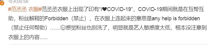 有網(wǎng)友指出,范丞丞穿的上衣圖案中的“I ?COVID-“19”這個詞很容易讓人想起對新冠肺炎的熱愛或支持,這在全球仍在抗擊新冠肺炎疫情的背景下尤為敏感。衣服上的其他圖像,包括眼睛犀利的男人(據(jù)說是查爾斯·曼森,一個臭名昭著的罪犯)和躺著的女人的形象,也被認(rèn)為是不恰當(dāng)和有爭議的。
