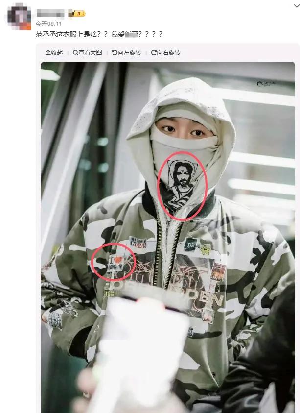 根據(jù)現(xiàn)場人員的描述,范丞丞當(dāng)時穿著一件設(shè)計獨特的夾克,上面印著顯眼的“I ?COVID-“19”字樣旁邊有很多被認(rèn)為是禁忌的圖像。這件衣服很快在網(wǎng)上引起軒然大波,網(wǎng)友們紛紛表達(dá)了自己的觀點和解讀。