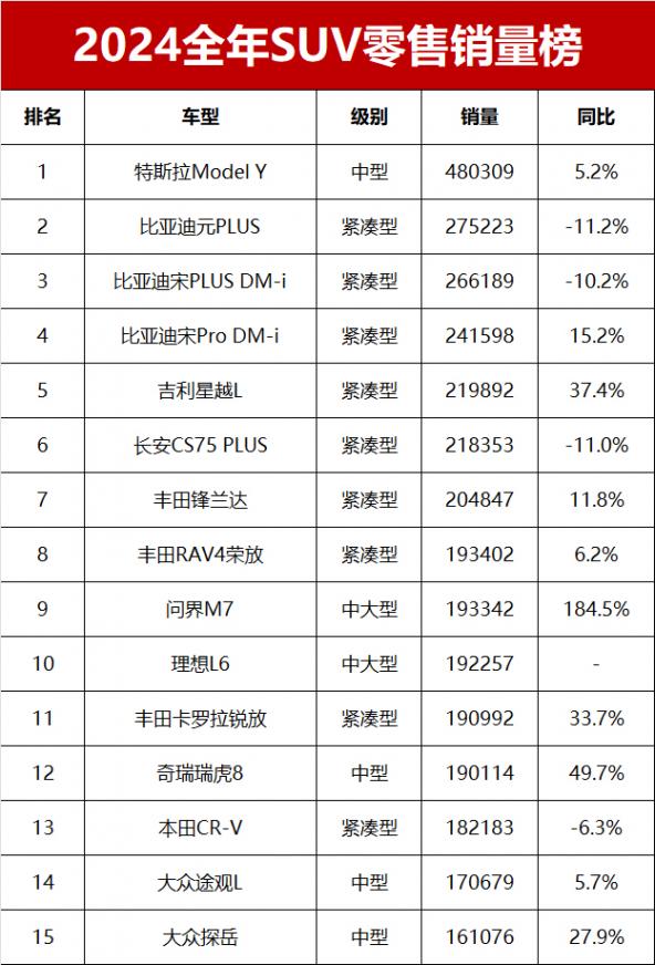 具體來看,2024年全年累計銷量超過10萬輛的SUV共有34款車型,其中月均銷量破萬輛的SUV共有26款車型。新能源成為SUV市場的最大贏家,全年銷量排名前四的SUV全部屬于新能源車。特斯拉Model Y一枝獨秀,以480309萬輛的銷量蟬聯(lián)SUV銷量冠軍。