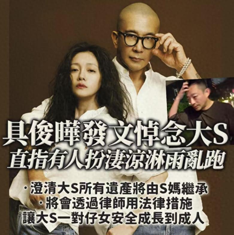 具俊曄表態,關于大S的所有遺產將由S媽繼承,他將通過律師用法律措施讓大S一對兒女安全成長到成人,也會維護好兩個孩子的權利,包括孩子應得的財產,言外之意,他不會讓汪小菲帶孩子回北京生活,而具俊曄發聲后,S媽也發聲了。