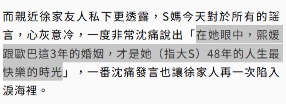 在大S去世后,S媽始終沒有露面, 這是她第一次發聲,她對所有謠言心灰意冷,悲痛說出:“在她眼中,熙媛跟歐巴的這三年的婚姻,才是她48年的人生最快樂的時光”。一度發言讓徐家人再一次陷入淚海里。