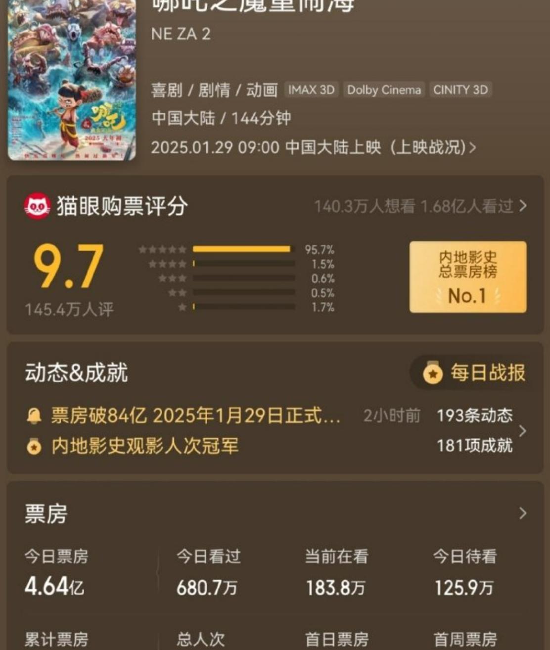 很多網(wǎng)友都把《哪吒2》票房和《阿凡達》票房做比較,目前《阿凡達1》以票房212億元位居全球第一。但212億這個數(shù)據(jù)是經(jīng)過多次重映累積出來的,所以以《哪吒2》現(xiàn)在的勢頭,想要超越重映多次才產(chǎn)生的全球第一,也許難度是大了點。