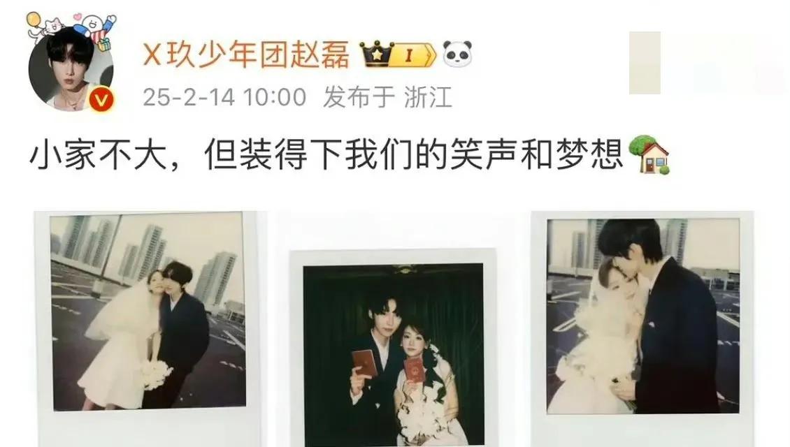 就在剛剛,X玖少年團成員趙磊在社交平臺官宣結婚,并且甜蜜的曬出了和老婆的結婚照