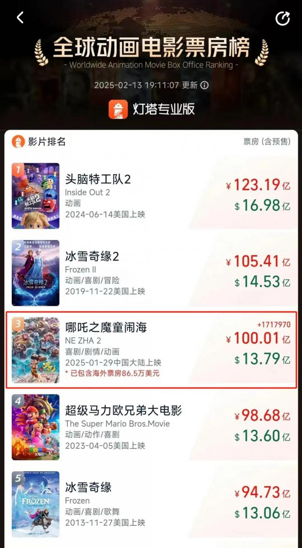 截至2月13日19時,《哪吒2》沖進全球動畫電影票房榜前3,成為全球動畫電影票房TOP3中唯一的非好萊塢影片。