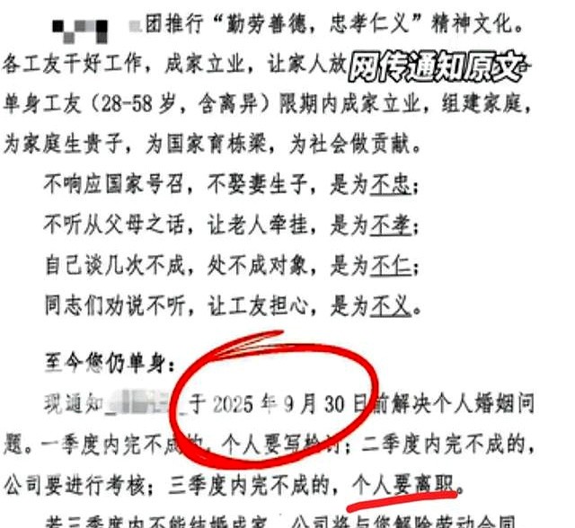 “單身員工必須半年內結婚,否則自離!”最近,這則來自山東某化工企業的內部通告震驚了不少人。