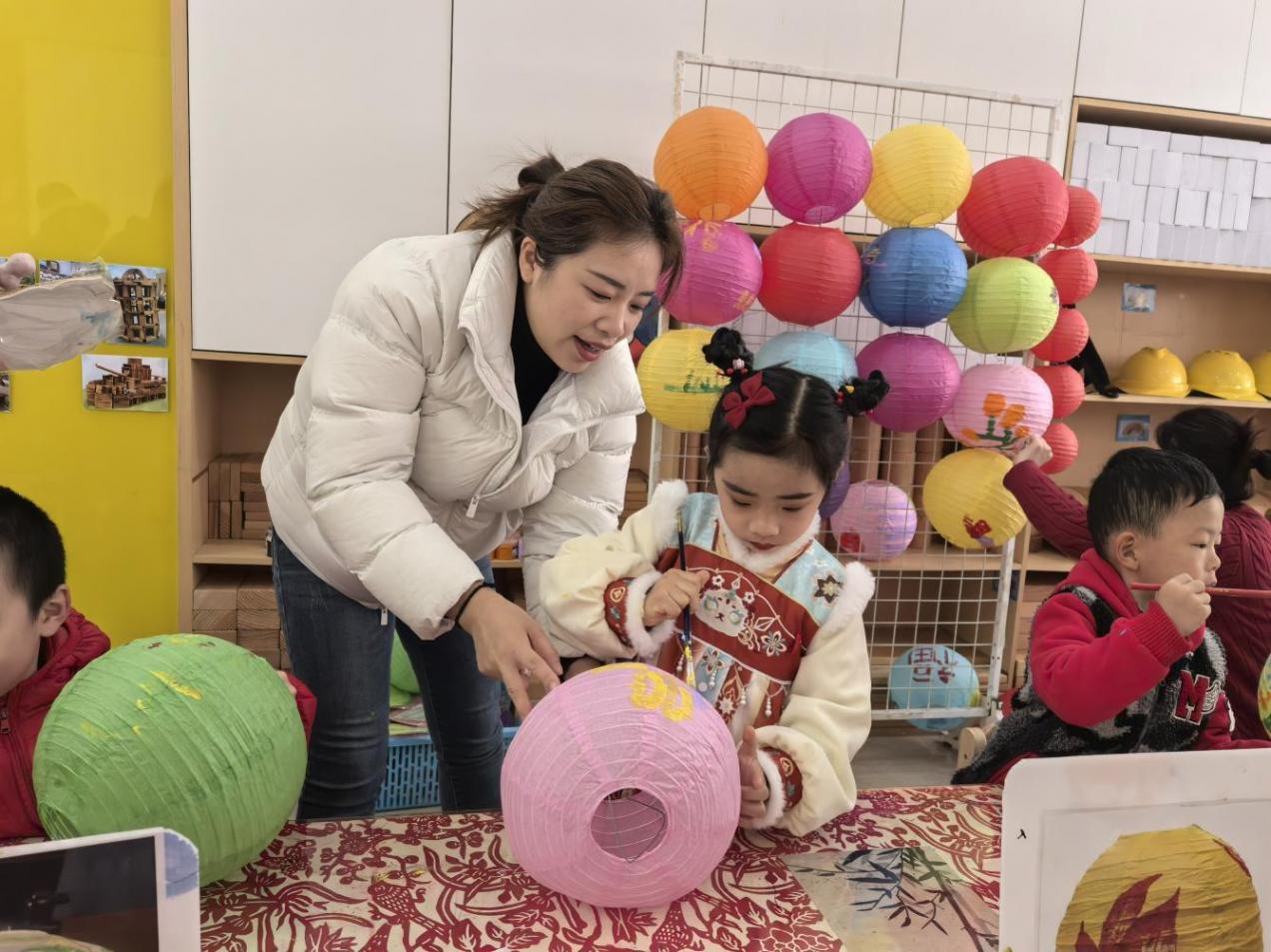 彩。大班小朋友舉著自制的花燈說:“我和媽媽畫了小蛇圖案,老師說這是蛇年的吉祥物!”