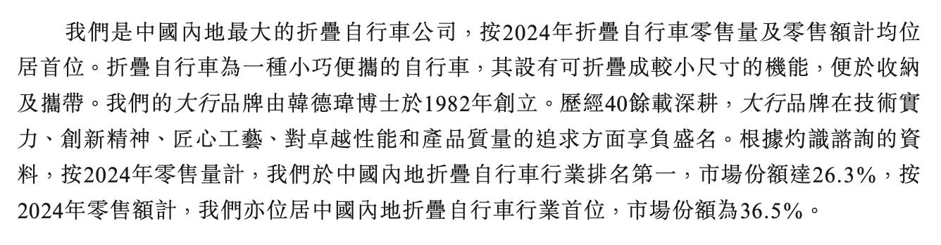 根據灼識諮詢的資料,按2024年零售量計,大行科工于中國內地折疊自行車行業排名第一,市場份額達26.3%,按2024年零售額計,公司亦位居中國內地折疊自行車行業首位,市場份額為36.5%。