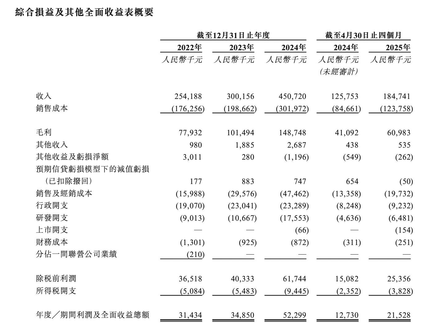 據招股書,2022年-2024年及2025年前4個月,大行科工實現收入分別為2.54億元、3億元、4.51億元、1.85億元;年度/期間利潤及全面收益總額分別為3143.4萬元、3485萬元、5229.9萬元、2152.8萬元。