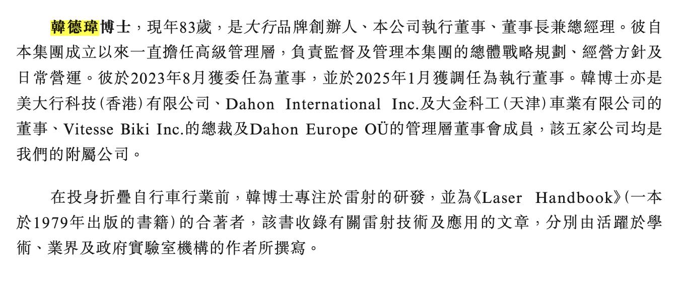 資料顯示,韓德瑋,現年83歲,是大行品牌創辦人、公司執行董事、董事長兼總經理。其自集團成立以來一直擔任高級管理層,負責監督及管理集團的總體戰略規劃、經營方針及日常營運。其于2023年8月獲委任為董事,并于2025年1月獲調任為執行董事。韓德瑋亦是美大行科技(香港)有限公司、Dahon International Inc.及大金科工(天津)車業有限公司的董事、Vitesse Biki Inc.的總裁及Dahon Europe OÜ的管理層董事會成員,該五家公司均是 公司附屬公司。