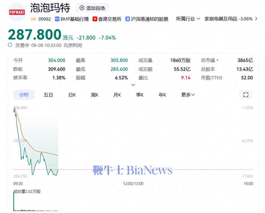 9月8日,截至發稿,泡泡瑪特(09992.HK)跌7.04%,報每股287.8港元。