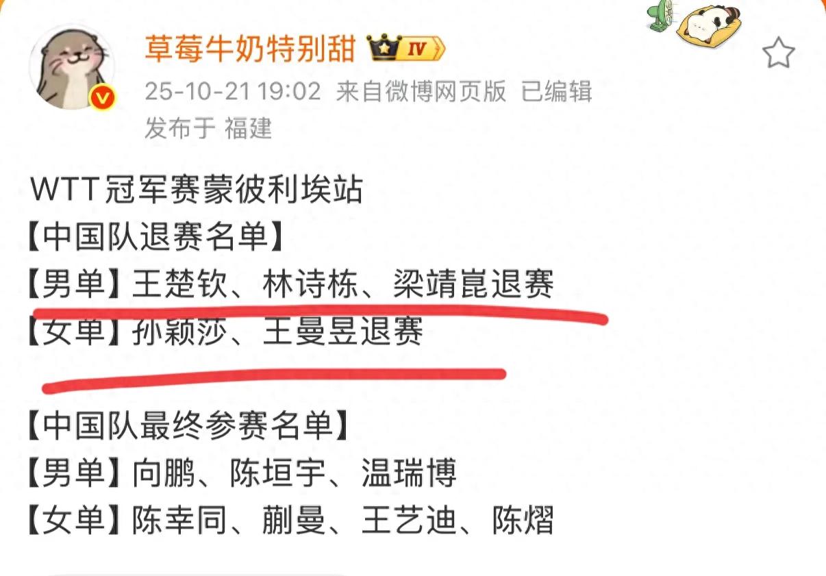 剛結束亞錦賽,運動員們的疲憊狀態都肉眼可見,大家都在猜測教練組會不會讓他們休息兩站比賽,好好備戰11月初的全運會呢?就在剛剛,WTT官網宣布了王楚欽、林詩棟、梁靖崑、孫穎莎、王曼昱5人均退了蒙彼利埃冠軍賽,后面的德國冠軍同全運會時間沖突了,必定也會退賽,這無疑是個好消息,主力運動員能有小半個月去備戰全運會了。但同時也讓林詩棟的世界排名岌岌可危!