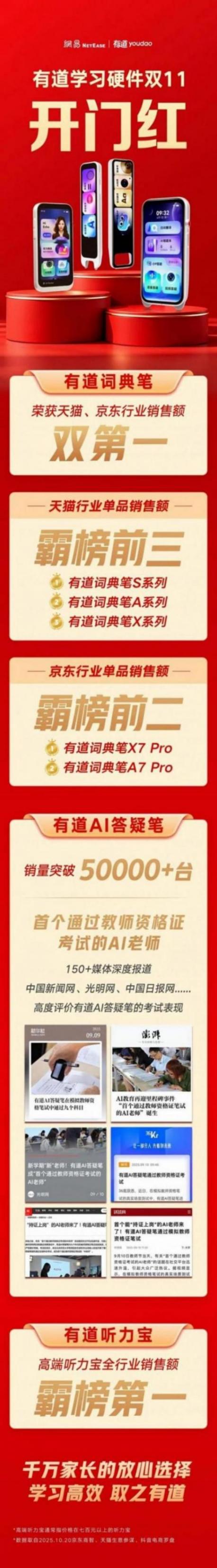 一年一度的雙十一大促已全面拉開(kāi)帷幕。10月20日晚,天貓雙十一正式開(kāi)賣(mài),首小時(shí)即有80個(gè)品牌成交破億,30516個(gè)品牌成交翻倍,均超去年開(kāi)賣(mài)首日。京東平臺(tái)同樣表現(xiàn)強(qiáng)勁,自促銷(xiāo)啟動(dòng)以來(lái),整體銷(xiāo)售增長(zhǎng)顯著,超5.2萬(wàn)個(gè)品牌成交額同比增長(zhǎng)超300%。其中,消費(fèi)電子與智能學(xué)習(xí)硬件成為拉動(dòng)增長(zhǎng)的重要引擎。智能學(xué)習(xí)硬件類(lèi)目中,領(lǐng)軍品牌網(wǎng)易有道持續(xù)領(lǐng)跑,多款智能學(xué)習(xí)硬件產(chǎn)品霸榜行業(yè)第一,迎來(lái)雙十一開(kāi)門(mén)紅!