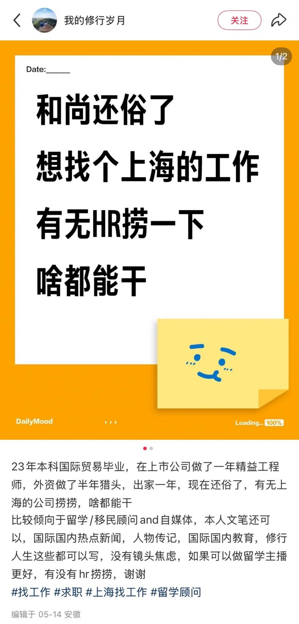 “2023年本科國(guó)際貿(mào)易畢業(yè),在上市公司做了一年精益工程師,外資做了半年獵頭,出家一年,現(xiàn)在還俗了,有無(wú)上海的公司撈撈,啥都能干。”