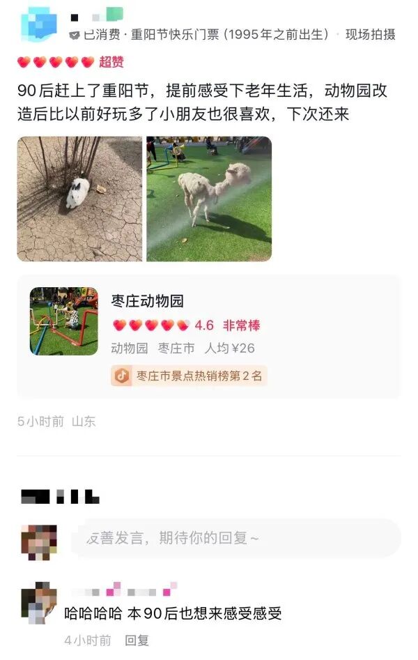 10月29日是重陽節,山東棗莊動物園的“重陽節快樂門票(1995年之前出生)”,僅售9.9元,引起關注,有網友疑惑“90后咋就成老年人了”,也有剛去逛完的消費者稱:“90后趕上了重陽節,提前感受老年生活,下次還來。”