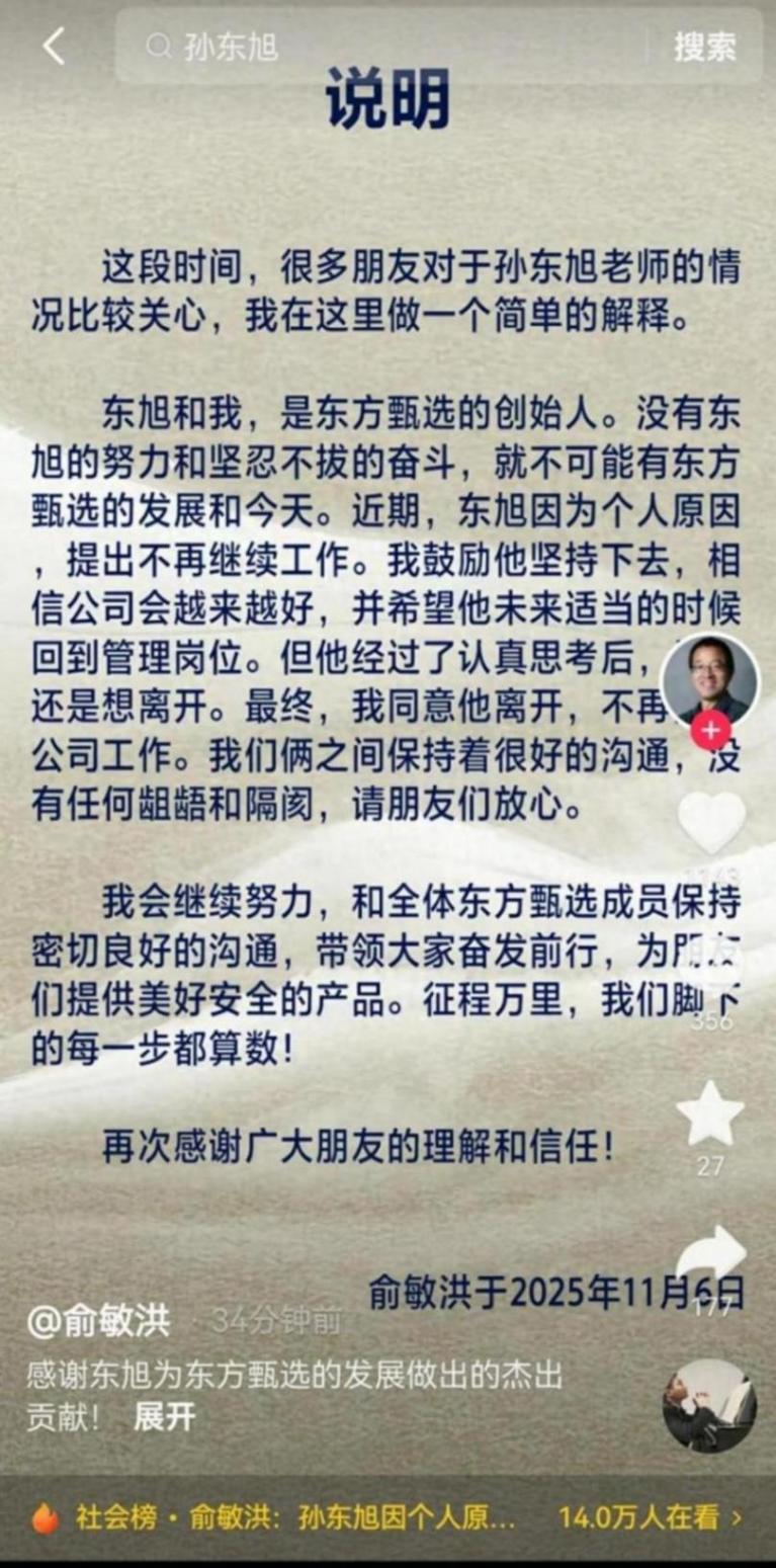 11月6日下午,新東方創(chuàng)始人俞敏洪在抖音平臺發(fā)布說明稱,近期,東方甄選前CEO孫東旭因為個人原因,提出不再繼續(xù)工作。最終,俞敏洪同意他離開,不再參與公司工作。