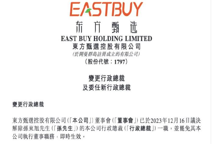 2023年12月,東方甄選宣布,經(jīng)董事會決定,董事長俞敏洪兼任東方甄選CEO職務(wù),免去孫東旭的東方甄選執(zhí)行董事、CEO職務(wù)。