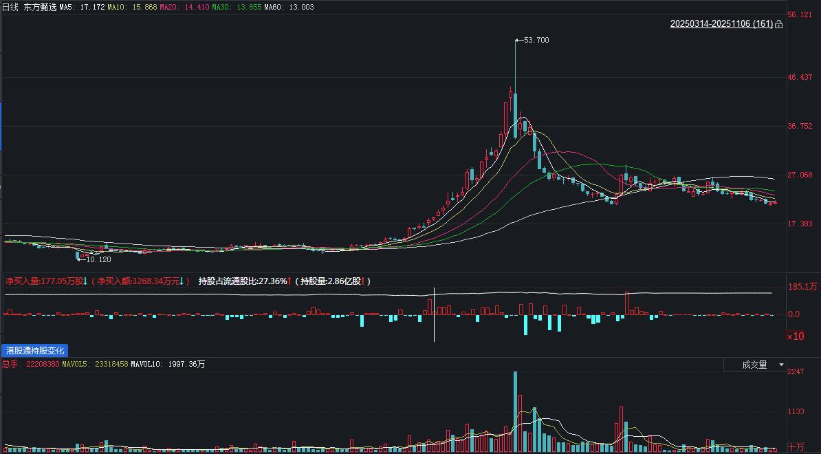 二級市場上,截至11月6日收盤,東方甄選(01797)上漲1.03%報21.58港元/股,總市值約227.41億港元,今年來公司股價累計上漲兩成。