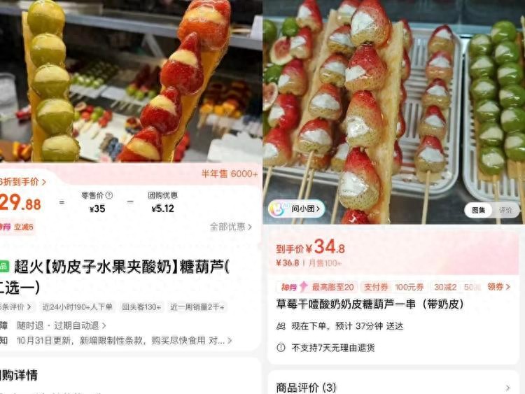 11月10日,潮新聞記者在某外賣平臺看到,一款未加干噎酸奶的晴王奶皮子糖葫蘆,原價38元,秒殺價格為18.8元,近一周銷量1000+,近24小時銷量200+;一款奶皮子水果夾酸奶的糖葫蘆,原價35元,到手價29.88元,半年銷售6000+,近一周銷量2000+;最貴的一款奶皮子水果糖葫蘆價格為48元。