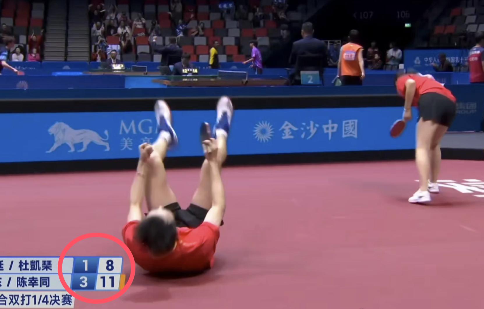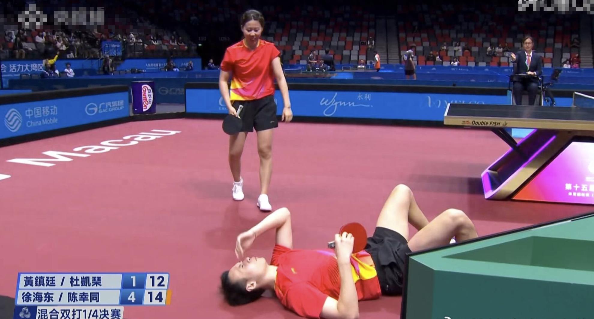 全運會混雙的比賽出現了一個非常爆笑的場面和非常神奇的鏡頭,在陳幸同與徐海東對陣黃鎮廷和杜凱琹的比賽當中,由于徐海東記錯了本場比賽的場次,所以在比賽還沒結束的時候,他剛得了分就直接躺在地上進行了一個激情慶祝,球沒打完,先慶祝半場開香檳,太搞笑了。