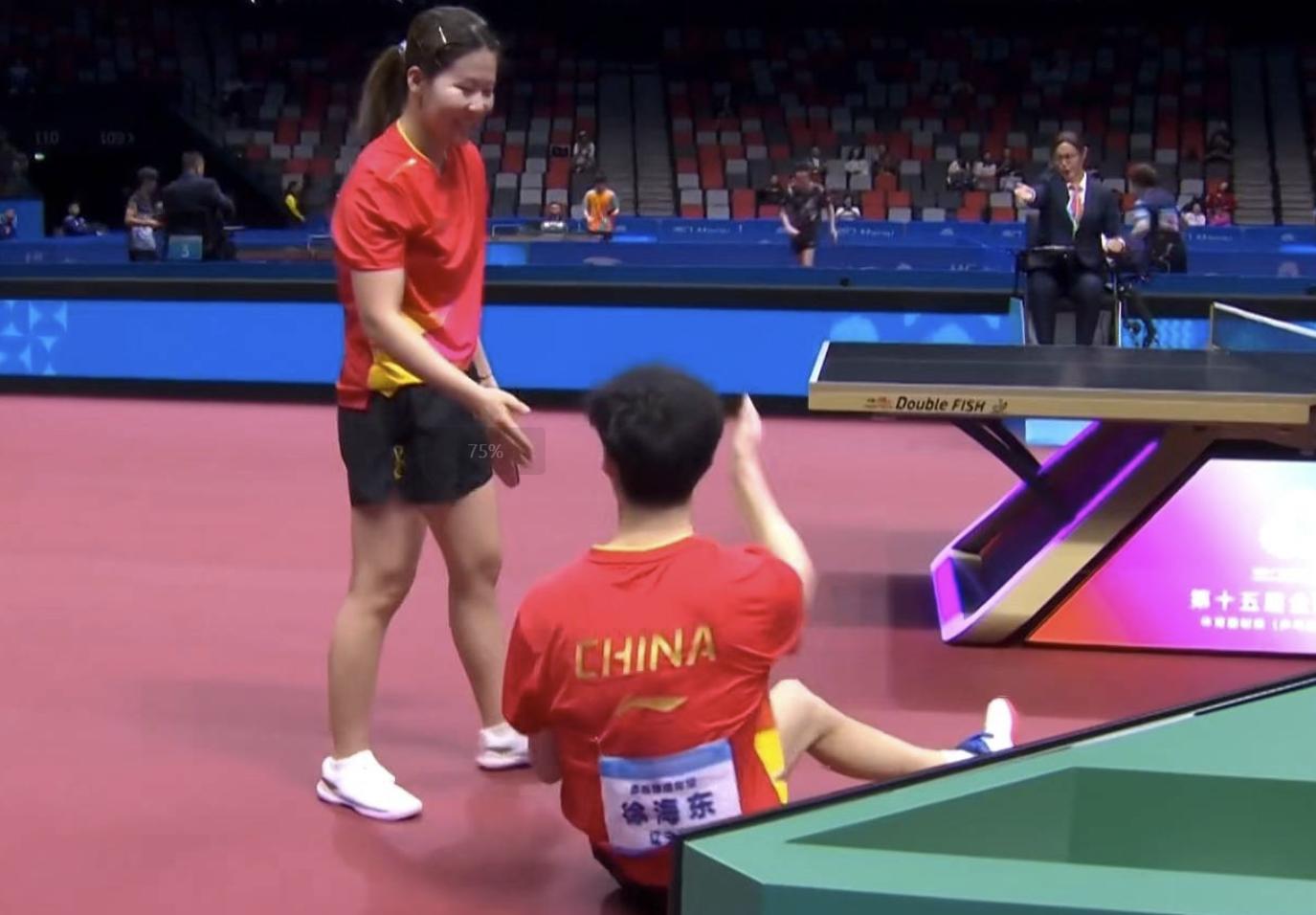 當時這一幕發生在本場比賽進行到第4局,陳幸同和徐海東得分之后,拿下本局3-1領先的時候,徐海東直接握緊雙拳倒地慶祝,非常激動,可實際上他記錯了混雙比賽的具體局數。這場球是7局4勝制,不是5局3勝制,3-1領先又如何?比賽還沒結束呢。