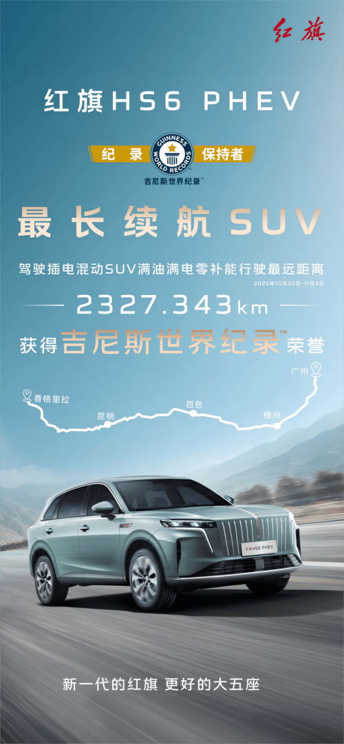 更令人振奮的是,紅旗HS6并非停留在紙面參數。在真實路況的極限挑戰中,紅旗HS6以“滿油滿電2327.343公里”的成績,成功斬獲吉尼斯世界紀錄認證,成為全球續航最長的混動SUV。這一壯舉也迅速引爆社交平臺,#中國混動破世界紀錄#話題強勢登上新浪微博總榜第17位、科技榜第2位,彰顯出國人對混動技術突破的高度關注與認可。