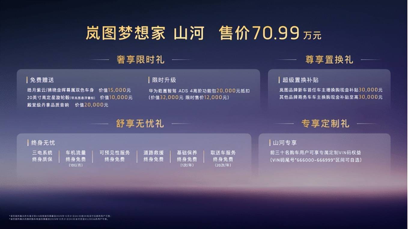11月21日,廣州車展盛大啟幕,“新時(shí)代旗艦四座MPV”嵐圖夢(mèng)想家山河正式上市,售價(jià)70.99萬元。同步推出山河專屬四重禮,包含皓月紫云/拂曉金輝尊屬雙色車身、20英寸高定星漩輪轂(帶嵐圖懸浮徽標(biāo)),及殿堂級(jí)丹拿品質(zhì)音響;華為乾崑智駕ADS 4高階功能包現(xiàn)金抵扣;超級(jí)置換補(bǔ)貼;專屬定制VIN碼權(quán)益;三電系統(tǒng)終身質(zhì)保、車機(jī)流量終身免費(fèi)、道路救援終身免費(fèi)等權(quán)益。