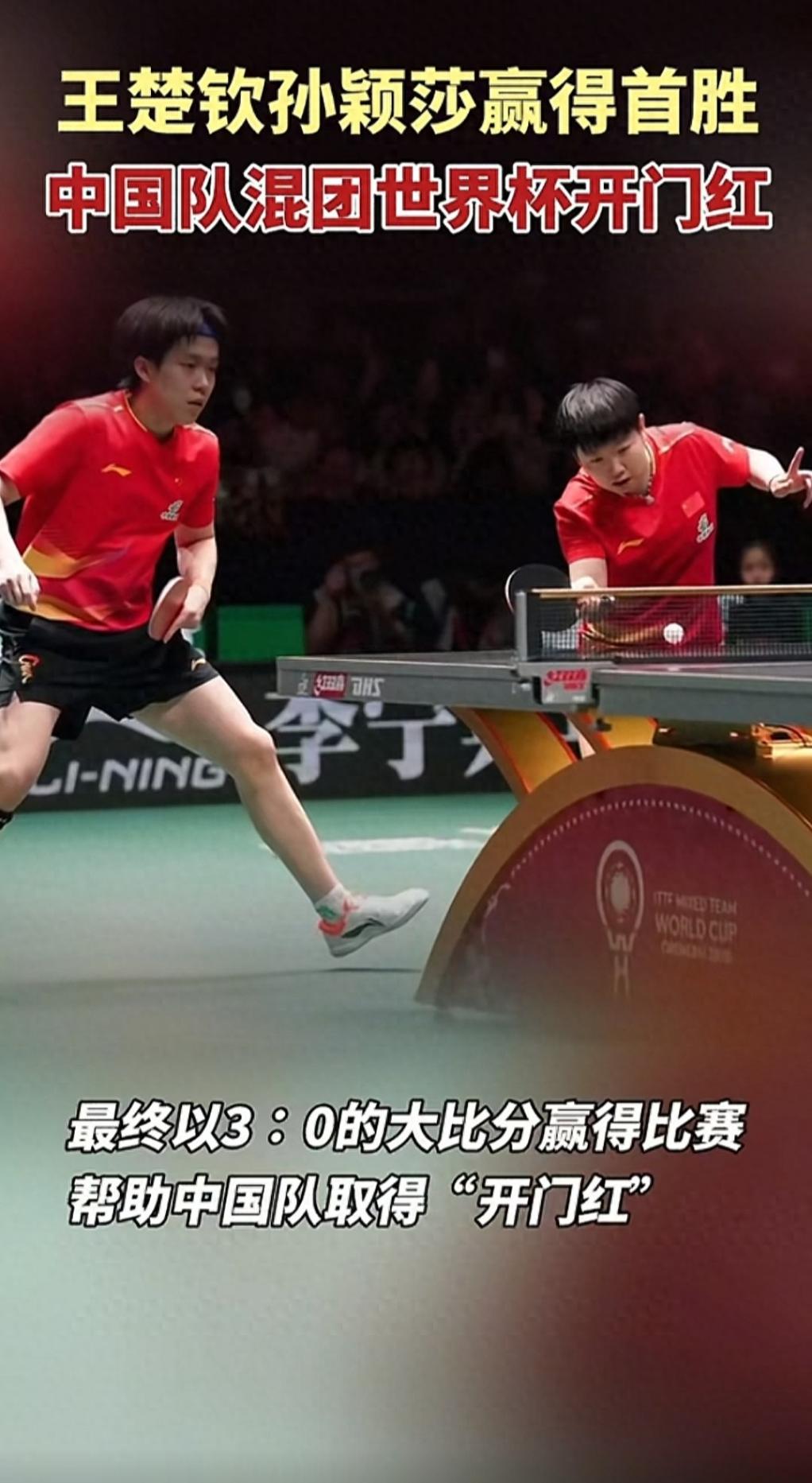 11月30日,成都混合團體世界杯首盤對決精彩上演,國乒王牌組合王楚欽/孫穎莎(“莎頭組合”)以3比0的絕對優勢戰勝黃鎮廷/杜凱琹組合,為中國隊取得開門紅。