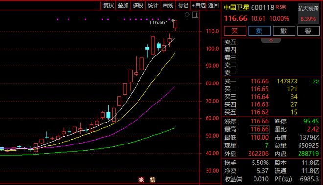中國衛星(600118)封板漲停,再創歷史新高,成交額超70億元,最新市值1379億元。